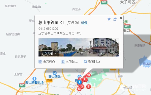 鞍山客運總站320米向東步行 到 天河大廈3站乘 401路 (萬華街方向) 到 山南小學(xué)230米向南步行 到 鞍山市鐵東區(qū)口腔醫(yī)院