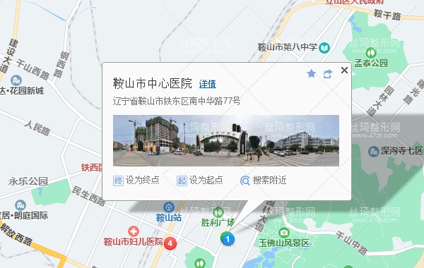 鞍山站360米向南步行 到 鞍山站2站乘 43路 (萬華街方向) 到 烈士山550米向東北步行 到 鞍山市中心醫(yī)院整形外科