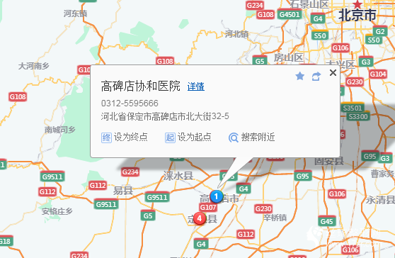 保定站210米向西南步行 到 火車站西廣場11站乘 1路 (客運中心方向) 到 氣象局3米站內換乘 37路4站乘 37路 (客運中心方向) 或 50路 36路 到 客運中心80米向東步行 到 客運中心9站乘 622路 (淶水汽車站方向) 到 高碑店430米向東北步行 到 高碑店協(xié)和醫(yī)院