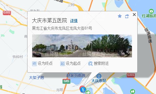 大慶東站890米向東北步行 到 經(jīng)緯壹號5站乘 32路 (廠西方向) 到 五醫(yī)院280米向東南步行 到 大慶市第五醫(yī)院