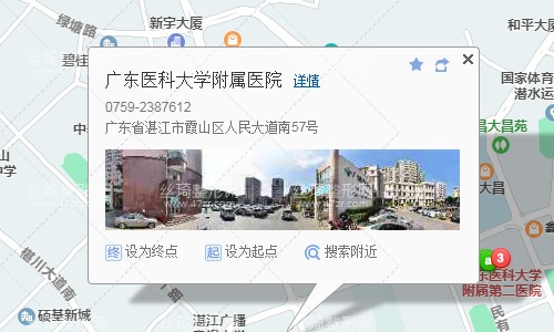 湛江站590米向東步行 到 南站批發(fā)市場(chǎng)5站乘 港城二中1號(hào)專線 (中英文學(xué)校方向) 到 附屬醫(yī)院30米向南步行 到 廣東醫(yī)科大學(xué)附屬醫(yī)院,