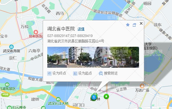 宏基汽車客運站440米向西南步行 到 武昌火車站 F口進站2站乘 軌道交通7號線 (園博園北方向) 到 螃蟹岬 E口 出站320米向東步行 到 中山路螃蟹岬2站乘 717路 (武金堤公路武泰閘方向) 或 573路 到 糧道街胭脂路360米向東北步行 到 湖北省中醫(yī)院醫(yī)學美容科