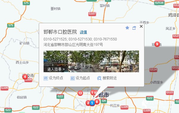 邯鄲客運樞紐中心530米向西北步行 到 高鐵站(南)8站乘 K5路 (峰峰市區(qū)方向) 到 棉一620米向東南步行 到 邯鄲市口腔醫(yī)院