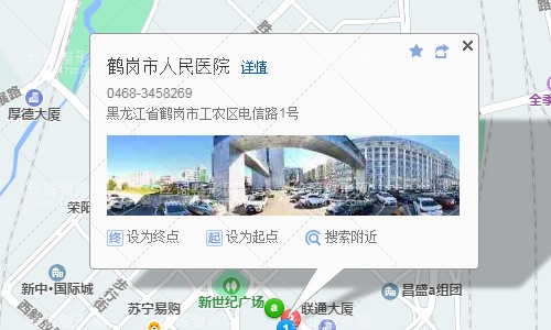 鶴崗火車站200米向西北步行 到 火車站1站乘 28路 (新世紀廣場方向) 或 8路 6路 2路 1路 到 新世紀廣場410米向東步行 到 鶴崗市人民醫(yī)院