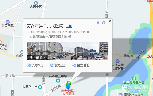 菏澤站400米向西北步行 到 火車站10站乘 10路 (天華電商集聚園區(qū)西門方向) 到 太原路小學470米向東步行 到 菏澤市第二人民醫(yī)院