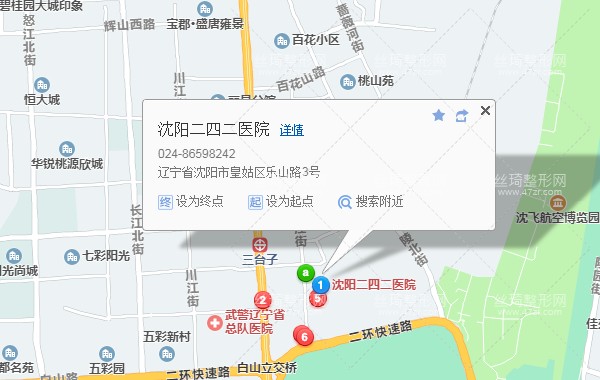 沈陽長途客運總站120米向東北步行 到 天江老龍口6站乘 沈陽-法庫西線 (法庫客運站方向) 到 沈飛集團850米向西步行 到 沈陽二四二醫(yī)院