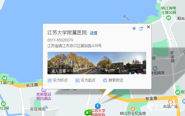 鎮(zhèn)江站340米向東北步行 到 火車站北8站乘 123路 (宗澤路停車場方向) 到 江濱醫(yī)院70米向南步行 到 江蘇大學附屬醫(yī)院