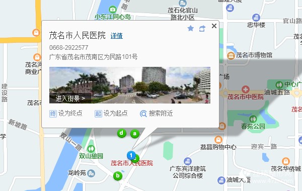 茂名站570米向西步行 到 河?xùn)|客運(yùn)中心8站乘 3路 (茂名技師學(xué)院方向) 到 人民醫(yī)院590米向西南步行 到 茂名市人民醫(yī)院
