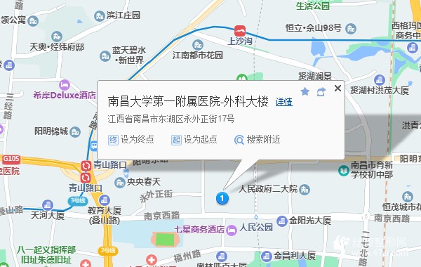 南昌長途汽車站180米向西南步行 到 南昌火車站 2口 進站5站乘 地鐵2號線 (南路方向) 到 青山路口 2口 出站1.1公里向東步行 到 南昌大學第一附屬醫(yī)院-綜合大樓