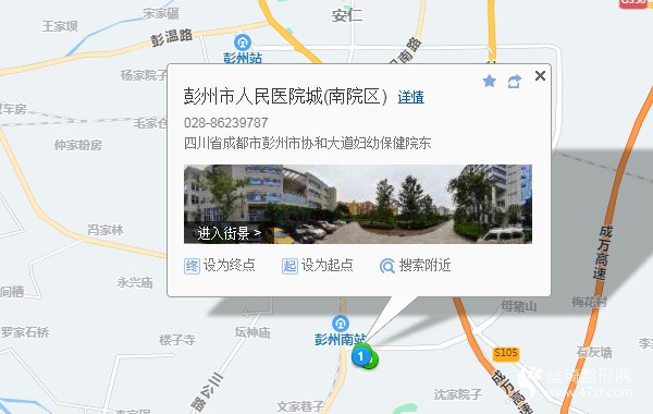 彭州站170米向北步行 到 快鐵彭州南站1站乘 彭州122路 (龍興寺方向) 到 新人民醫(yī)院站50米向西步行 到 彭州市人民醫(yī)院