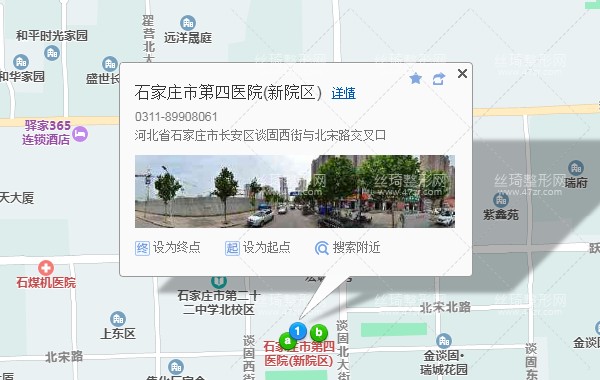 石家莊站200米向東步行 到 火車站(東廣場)5站乘 516路 (藁城汽車站方向) 或 55路到 天津銀行640米向北步行 到 石家莊第四醫(yī)院,