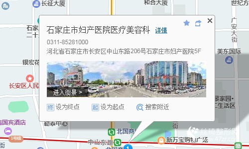 石家莊站230米向南步行 到 石家莊站 東1口 進(jìn)站5站乘 軌道交通2號線 (柳辛莊方向) 到 北國商城 B1口(東南口) 出站350米向東南步行 到 石家莊市婦產(chǎn)醫(yī)院醫(yī)療美容科