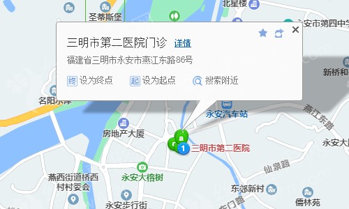 三明站490米向南步行 到 三明站(東)1站乘 K26路 (萬壽巖方向) 到 巖前郵政120米向東步行 到 巖前5站乘 城關(guān)-白葉坑 (白葉坑方向) 到 星橋10米站內(nèi)換乘 永安星橋線28站乘 永安星橋線 (閩運汽車站方向) 到 閩運汽車站460米向西南步行 到 三明市第二醫(yī)院門診,