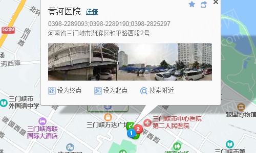 三門峽站150米向西南步行 到 火車站8站乘 迎賓1號公交專線 (高鐵南站方向) 或 9路 到 六峰路湖濱廣場690米向西北步行 到 黃河醫(yī)院