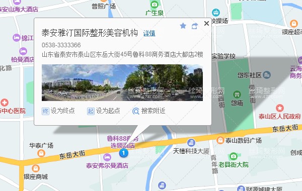 泰安站310米向東南步行 到 高鐵泰安站1站乘 游4路 (寶泰隆旅游度假區(qū)方向) 到 泰山火車站1.1公里向東步行 到 泰安雅汀國際整形美容機構,