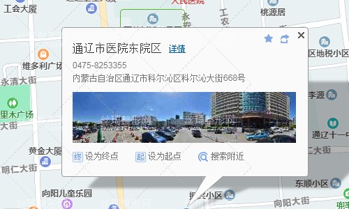 通遼站110米向東北步行 到 火車站2站乘 9路外環(huán) (人民公園方向) 到 市醫(yī)院140米向東步行 到 通遼市醫(yī)院,