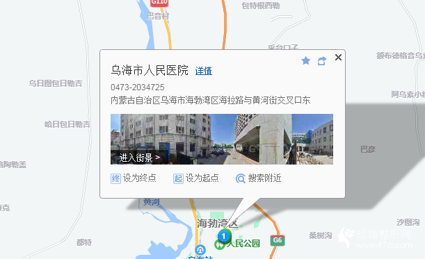 烏海站1.3公里向東步行 到 淘利商場4站乘 10路 (摩爾溝方向) 到 渤海灣區(qū)圖書館280米向東南步行 到 烏海市人民醫(yī)院