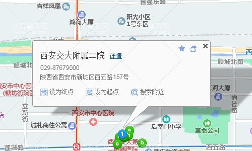西安南站170米向西步行 到 西安南站15站乘 340路 (東長安街神舟四路口方向) 到 東長安街神舟四路口350米向東步行 到 東長安街 D口 進(jìn)站6站乘 地鐵4號線 (北客站(北廣場)方向) 到 大雁塔90米向東步行 到 大雁塔1站乘 地鐵3號線 (魚化寨方向) 到 小寨1米向東步行 到 小寨5站乘 地鐵2號線 (北客站方向) 到 北大街 D口(東北口) 出站420米向東步行 到 西安交大附屬二院。