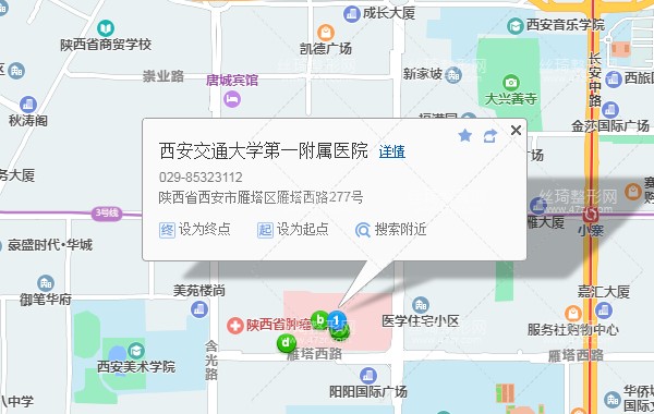 西安火車站330米向南步行 到 火車站1站乘 201路 (西辛莊方向) 或 251路 5路41路 500路 到 五路口260米向東步行 到 五路口 B口(西南口)進站5站乘 地鐵4號線 (航天新城方向) 到 大雁塔90米向東步行 到 大雁塔2站乘 地鐵3號線 (魚化寨方向) 到 吉祥村 D口(東北口) 出站720米向南步行 到 西安交通大學醫(yī)學院第一附屬醫(yī)院。