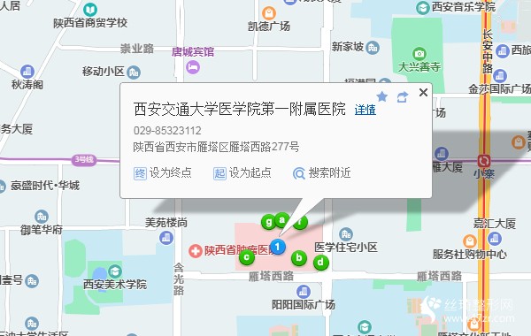 西安站南廣場1公里向南步行 到 五路口 A口(西北口)進站1站乘 地鐵1號線 (灃河森林公園方向) 到 北大街5站乘 地鐵2號線 (韋曲南方向) 到 小寨1米向東步行 到 小寨1站乘 地鐵3號線 (魚化寨方向) 到 吉祥村 D口(東北口) 出站690米向東南步行 到 西安交通大學(xué)醫(yī)學(xué)院第一附屬醫(yī)院