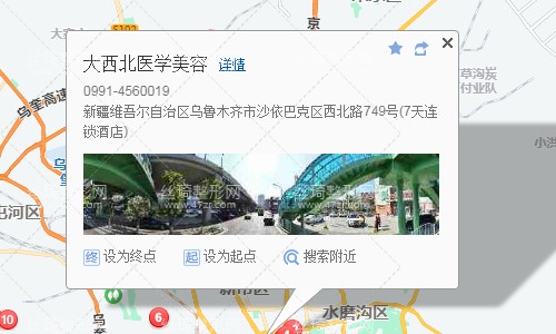 烏魯木齊站910米向西北步行 到 烏魯木齊站北廣場6站乘 BRT5路 (南湖東路方向) 到 兒童村80米向東步行 到 兒童村6站乘 907路 (幸福城市花園方向) 或 301路 17路 到 橋頭80米向東北步行 到 大西北醫(yī)學(xué)美容