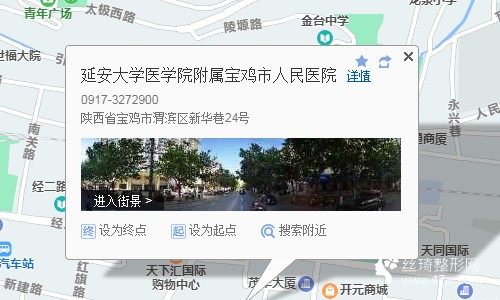 寶雞站280米向南步行 到 火車站廣場1站乘 8路 (經(jīng)一路口方向) 到 人民醫(yī)院460米向西南步行 到 延安大學醫(yī)學院附屬寶雞市人民醫(yī)院