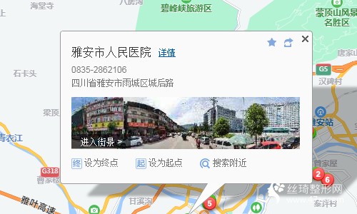 3、 雅安站600米向東南步行 到 雅安火車站18站乘 7路 (平安小區(qū)方向) 到 青衣江路中段1.3公里向西南步行 到 雅安市人民醫(yī)院