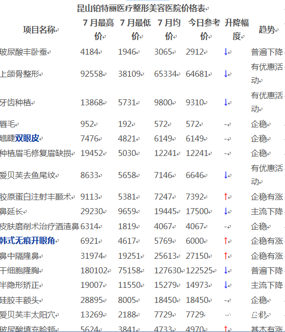 昆山鉑特麗醫(yī)療整形美容醫(yī)院價格表