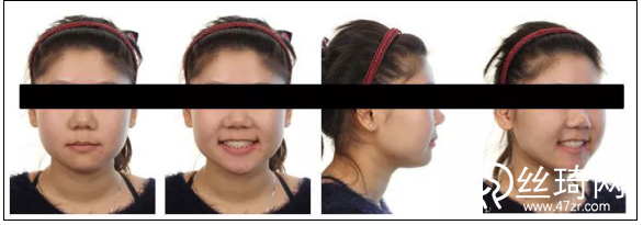 正面分析:面部基本對稱,面下1/3略長,開唇露齒,閉唇頦肌緊張